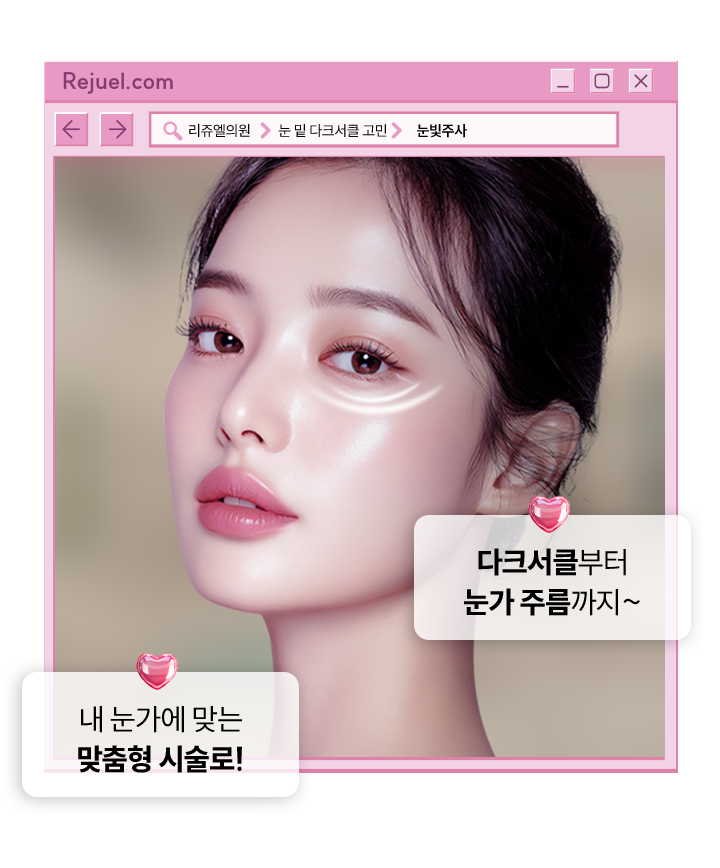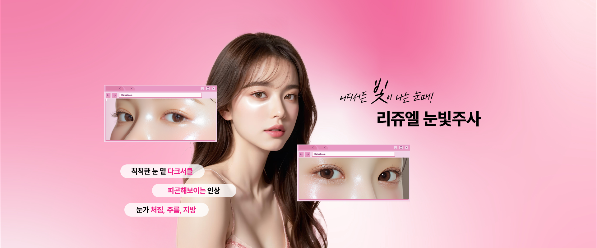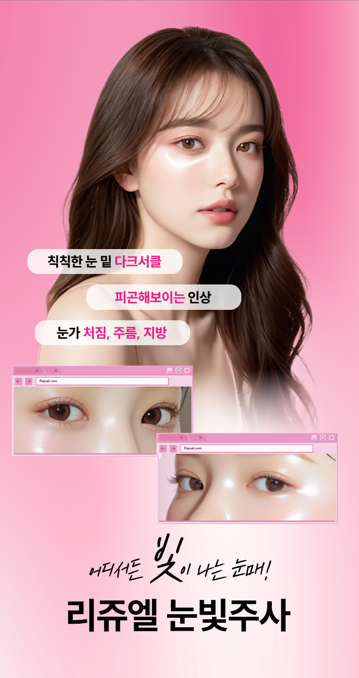 리쥬엘 의료진들의 오랜 임상 경험을 통해 개발된 눈빛주사의 레시피는 PDRN 성분이 눈 밑 손상된 피부 조직을 재생시키고, 스킨보톡스 성분을 통해