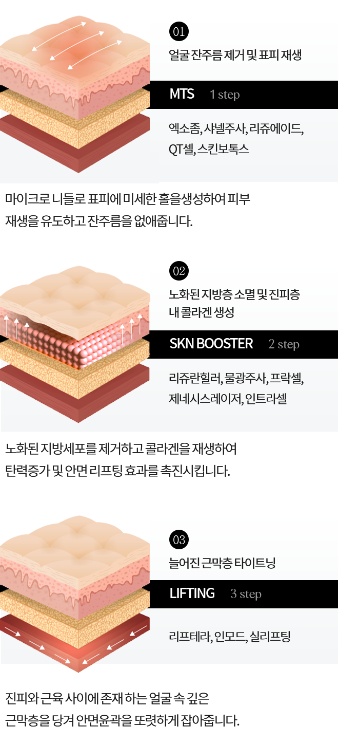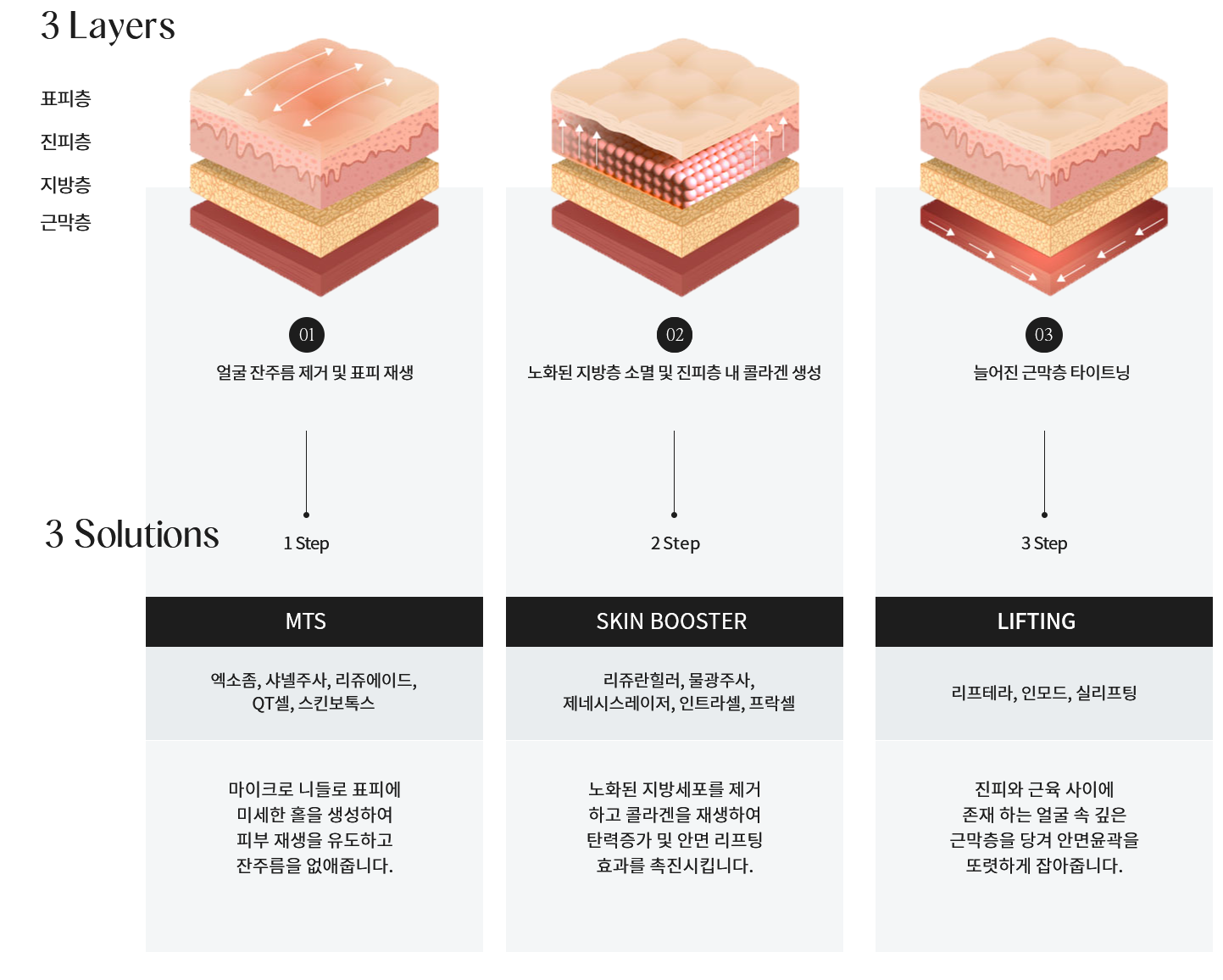 표피층-진피층-얼굴 속 깊은 근막층까지, 총 3개의 층을 빈 층 없이