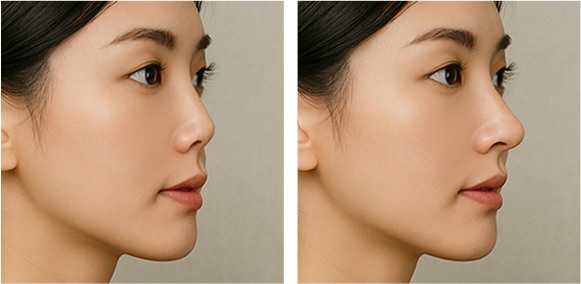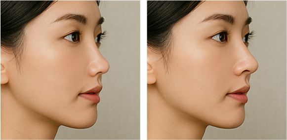 | 자연스러움 | 필러로 인한 볼록하거나 무거운 느낌 | 디자인에 따라 달라짐, 티 나는 경우도 있음 | 높지만 자연스럽고 얼굴과 조화되는 라인 완성 |